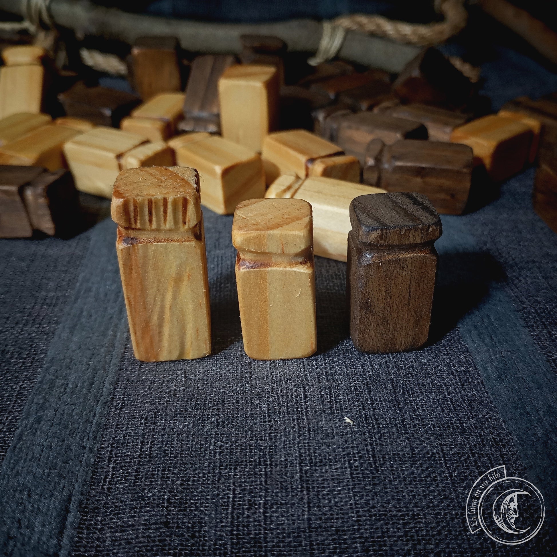 Hand-carved pine wood playing pieces for Hnefatafl or Tablut, the ancient Viking board game. Each set includes the king, defenders, and attackers, crafted with care for an authentic medieval feel. Perfect for replacing missing pieces or creating your own custom board.